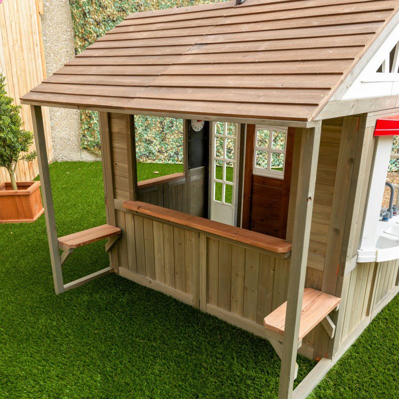 W środku znajduje się obszerna kuchnia dla dzieci z wieloma akcesoriami. Pozwala ona na urozmaicenie zabawy i przygotowywanie na niby wspaniałych potraw. W połączeniu z szerokim okienkiem do serwowania, można domek zmienić w genialną restaurację, lub kawiarnię. Podane potrawy można spożywać na ławeczkach, które znajdują się po obu stronach okienka.