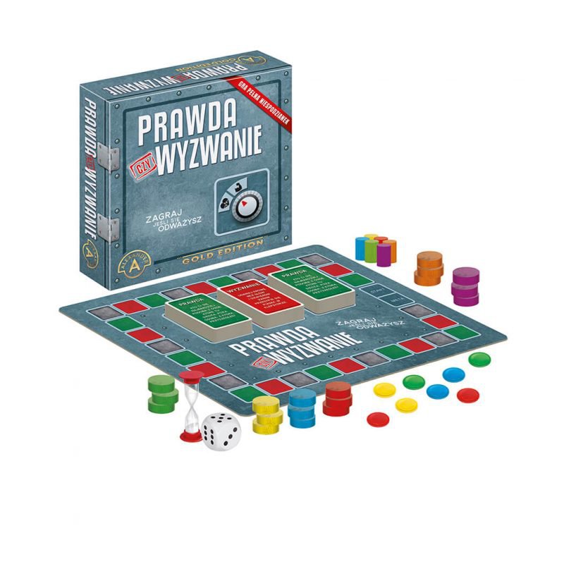 plansza - 1 szt., klepsydra - 1 szt., pionki drewniane - 6 szt., karty dwustronne „Prawda”- 55 szt., karty dwustronne „Wyzwanie”- 55 szt., karty dwustronne „Dla odważnych”- 55 szt., żetony - 80 szt., znaczniki drewniane - 18 szt., kostka - 1 szt., instrukcja