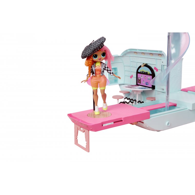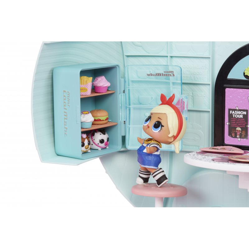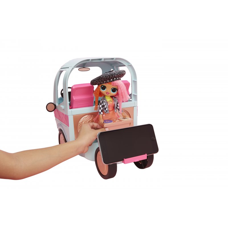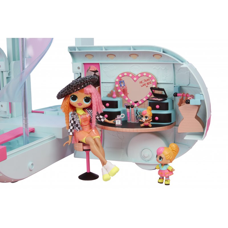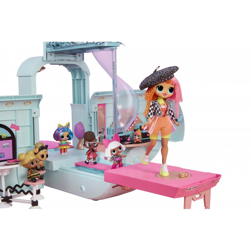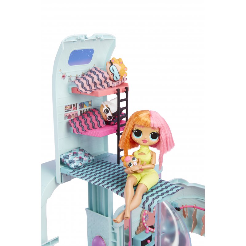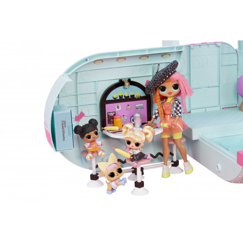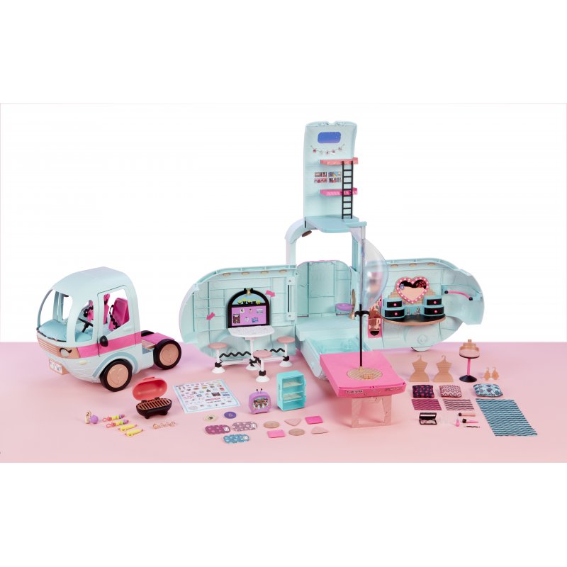 Z przodu znajdziesz konsolę didżejską, która ma regulowaną wysokość tak by laleczki z różnych serii np. LOL OMG mogły pokazać swój talent muzyczny. Kiedy podróżniczki zgłodnieją mogą rozpalić grill i upiec na nim pyszności, a potem zasnąć na piętrowym łóżeczku. Jednak, gdy przyjdzie czas imprezy będą mogły naszykować się w kąciku piękności z toaletką i lusterkiem, oraz wieszakiem na ubranka. Stylizację trzeba uwiecznić pozując na specjalnym wybiegu i pozując do zdjęcia.