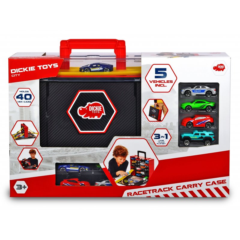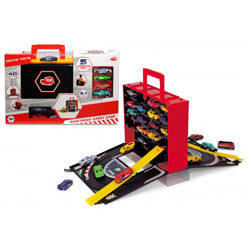 Pakowna i bardzo profesjonalnie prezentująca się walizka pomieści okazałą kolekcję chłopięcych resoraków. Pomoże również przetransportować ulubione pojazdy na tor wyścigowy lub plac budowy. Walizki Dickie Toys jest wyposażona w 5 metalowych pojazdów oraz elementy dróg i akcesoria, które rozbudzą wyobraźnię Twojego dziecka i zapewnią mu wspaniałą zabawę. Po rozłożeniu boków walizki, mały rajdowiec będzie miał dostęp do swojej kolekcji z każdej strony, a umieszczone na 6 kondygnacjach auta będą mogły zjeżdżać w dół po rampie, objeżdżać rondo i wjeżdżać na górę by zaparkować. Walizka nadaje się do autek w skali 1:64.