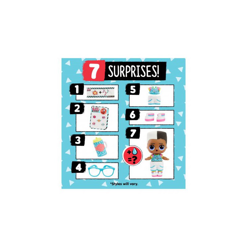 Tego jeszcze nie było! Do laleczek L.O.L Surprise dołączyli chłopcy! Teraz śliczne dziewczynki mają swoich braciszków! W kuli czekają kolejne niespodzianki do odkrycia, a zabawa zaczyna się już podczas rozpakowywania! Każda magiczna kula kryje w sobie aż 7 warstw, pod którymi skrywają się kolejne akcesoria do zabawy. Na końcu podróży z odkrywaniem czeka kolekcjonerska laleczka z serii Boys, ze specjalnymi umiejętnościami (np. zmienia kolor, płacze, robi siku, pluje wodą, tryska wodą uszami), które dziewczynki muszą samodzielnie wypróbować, a potem oznaczyć naklejką na kolekcjonerskim plakacie. W zestawie, oprócz lalki - chłopca, znajduje się także ubranko i akcesoria. Kula - niespodzianka po rozpakowaniu zamienia się w nosidełko, stojak dla ulubionej laleczki lub miejsce do zabawy.