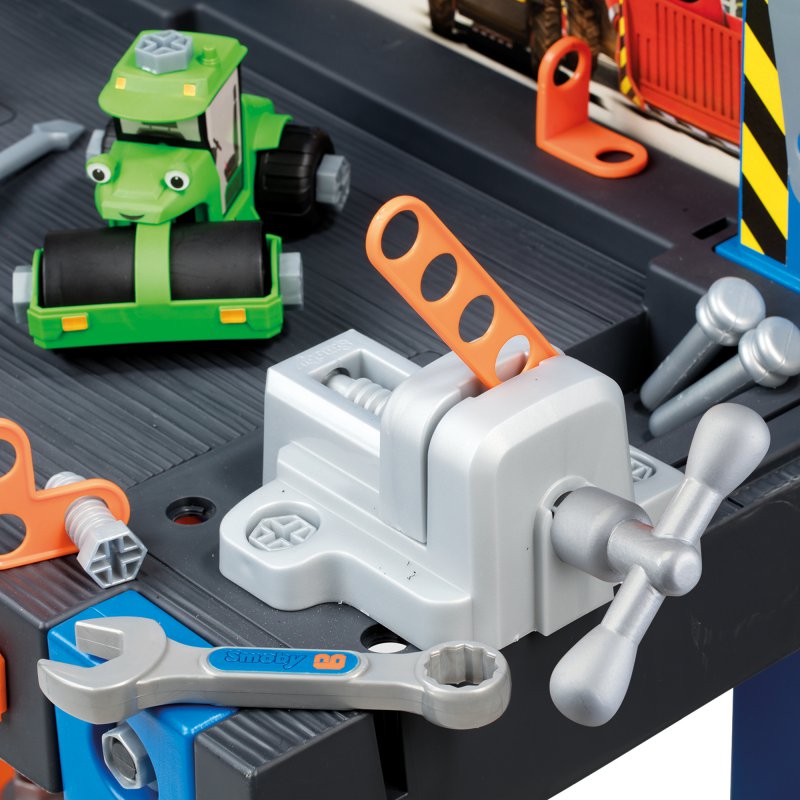 Duży zestaw, w skład którego wchodzi warsztat z imadłem, dźwig z wyciągarką, klucz, piła, młotek, śrubokręt, różne śrubki i nakrętki. Warsztat został wyposażony w sumie w aż 92 elementów. W zestawie znajdują się elementy do złożenia zielonego walca. Wszystkie narzędzia są lekkie, bezpieczne i wygodne dla dziecięcych rączek. Liczne uchwyty w blacie i ściance warsztatu oraz niezwykle praktyczne kuwetki i wygodna półka pod blatem, pomagają utrzymać porządek w trakcie i po zabawie.