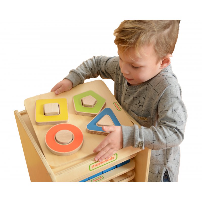 Drewniana, ekologiczna zabawka dla dzieci marki Masterkidz. Sorter kształtów składa się z zestawu 4 mniejszych klocków w kolorze drewna, oraz 4 dużych, kolorowych klocków. Zadaniem dziecka jest umieszczenie mniejszych klocków w otworach, które znajdują się na drewnianej deseczce, a następnie dopasowanie większych klocków jako "nakładki" na te mniejsze.