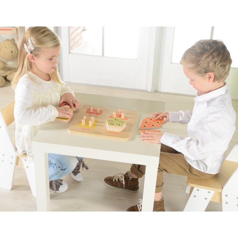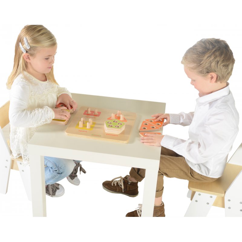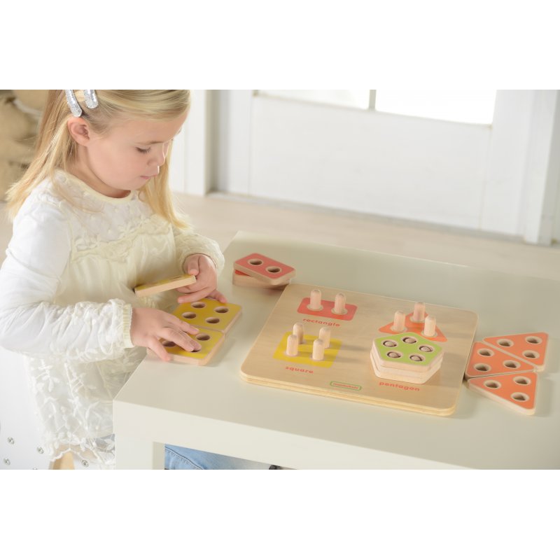 Drewniana zabawka sensoryczna edukacyjna dla dzieci, która polega na dopasowaniu kolorowych figur geometrycznych do odpowiednich kołeczków na planszy. Klocki można układać w wieże - jeden na drugim. Zabawka może być używana do nauki liczenia, dodawania i mnożenia.