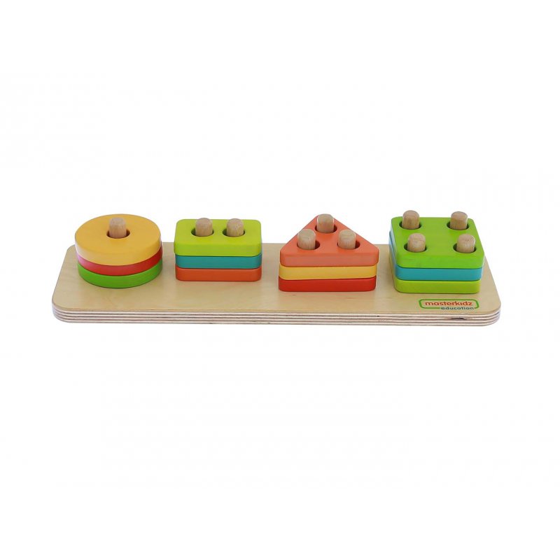 Zabawka składa się z zestawów różnych figur geometrycznych: kwadratów, trójkątów, prostokątów, oraz pierścieni. Zadaniem dziecka jest układanie figur w wieże po 3 sztuki.