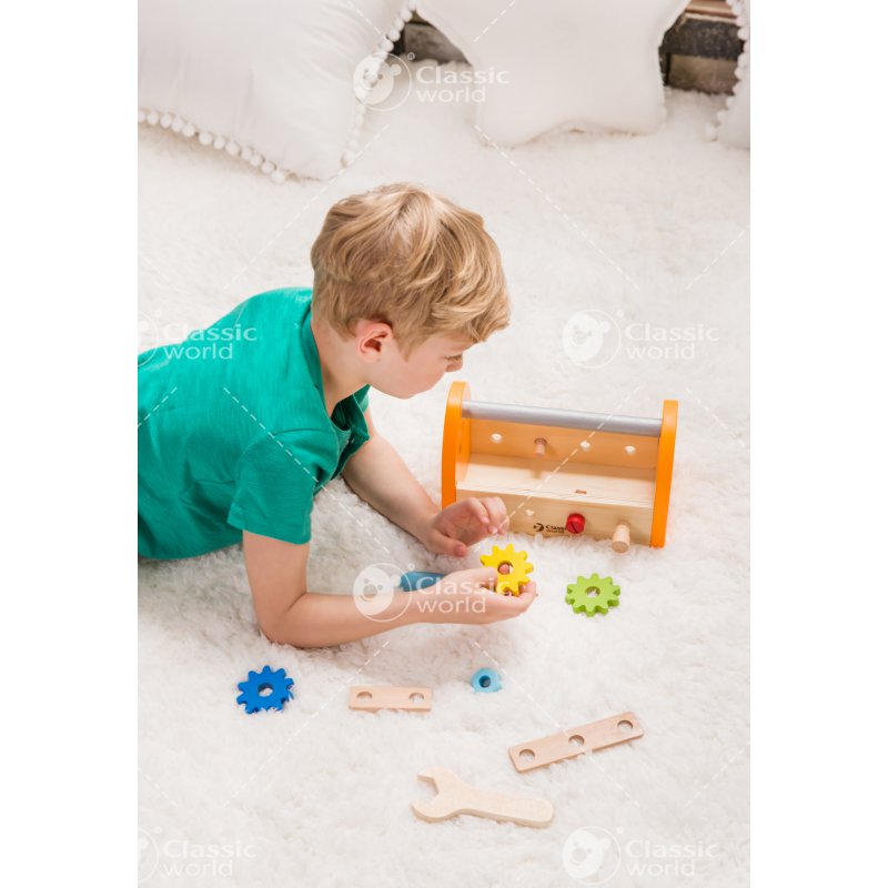 Całość została wykonana z drewna przez co jest bezpieczna dla dziecka! Dodatkowo po bokach skrzynki są otwory, a zestaw zawiera śrubki nakrętki i elementy, które można przykręcać i łączyć razem.