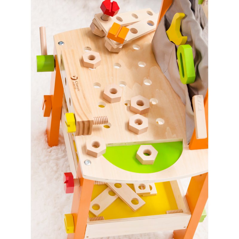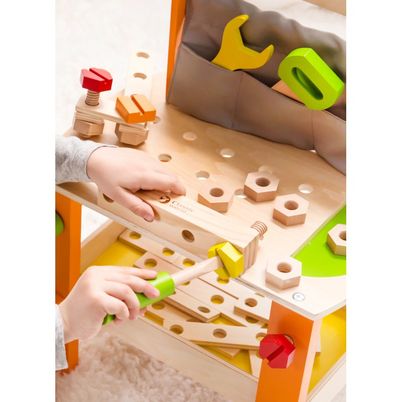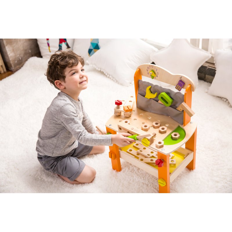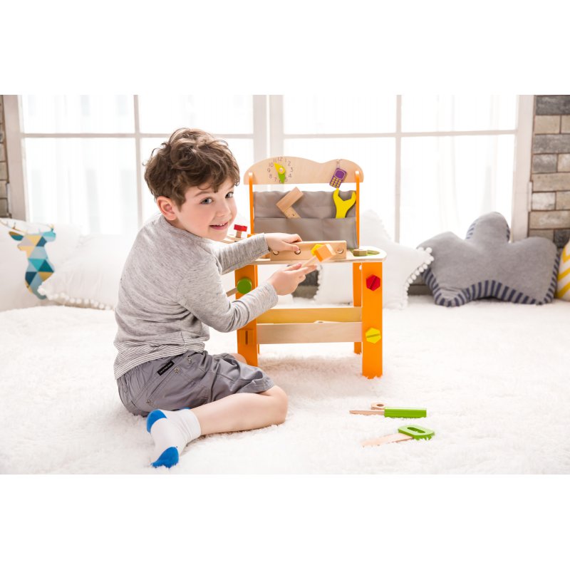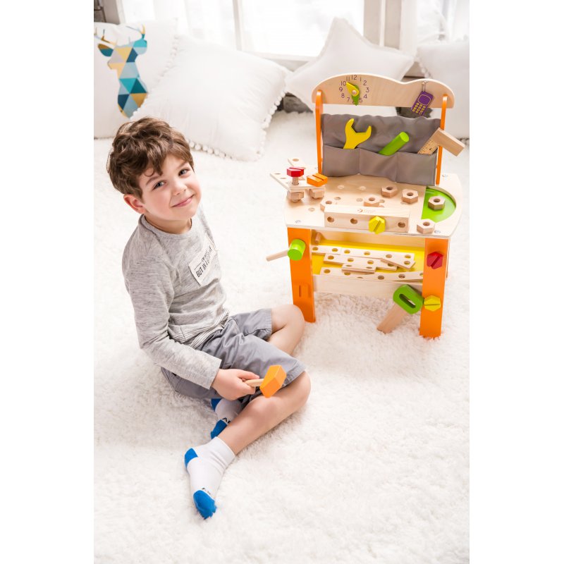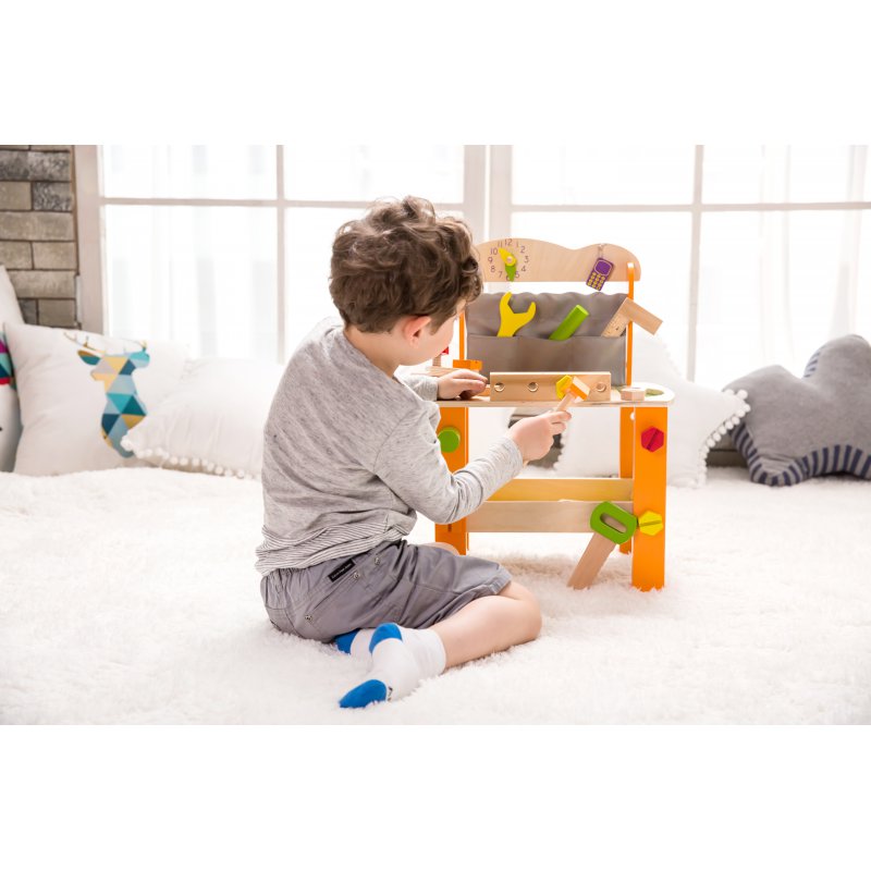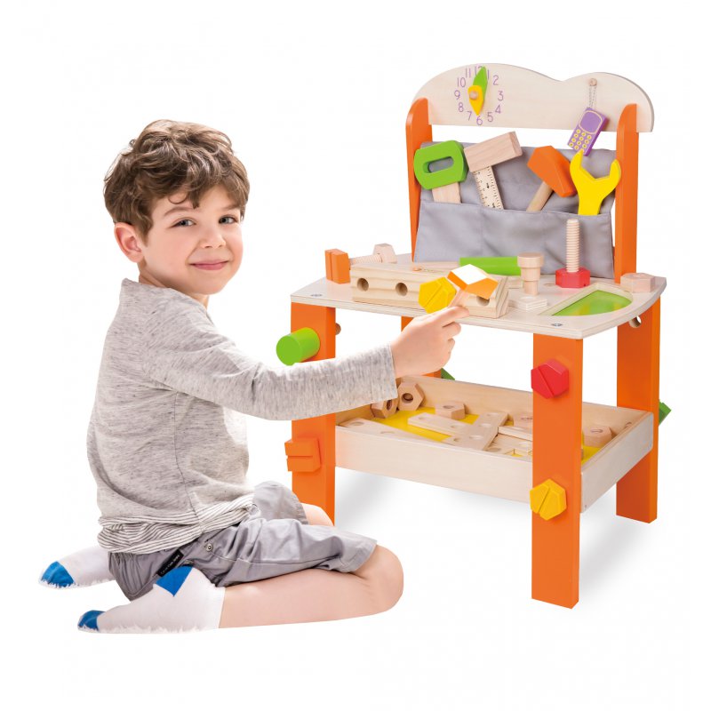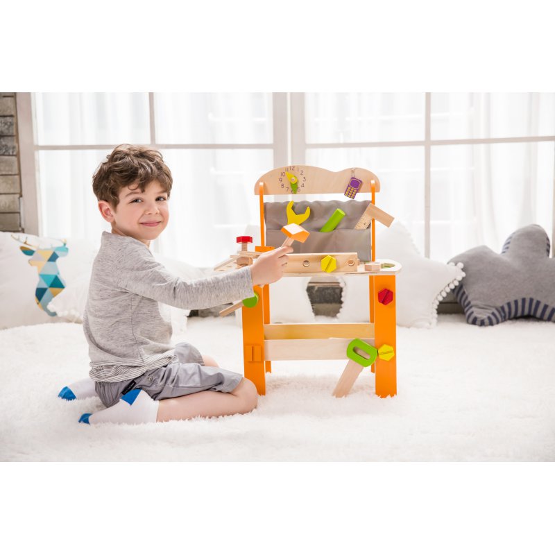 Wspaniały warsztat dla małego majsterkowicza z własnym stołem do napraw i z dużą ilością narzędzi. Wszystkie części warsztatu: narzędzia i śrubki wykonano z drewna, dlatego cały warsztat jest bezpieczny i przyjazny dla dziecka. Dodatkową zaletą jest to, że już do skręcenia samego warsztatu należy częściowo użyć śrubek z zestawu, więc już składanie zabawki jest zabawą.