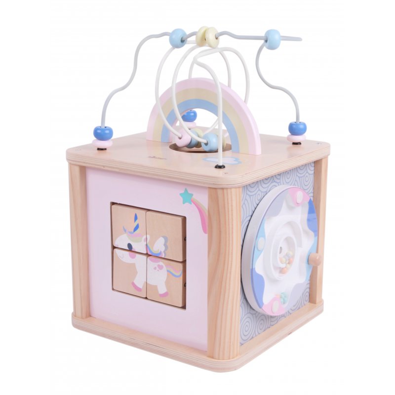 Wielofunkcyjna zabawka w formie drewnianej kostki, która na każdej ściance posiada jakąś atrakcję dla dzieci. Świetnie nadaje się dla maluchów w wieku od 18 miesięcy, ponieważ posiada wiele funkcji, które doskonale wpłyną na ich rozwój: przeplatanka motoryczna, sorter kształtów, klocki z jednorożcem, oraz więcej.